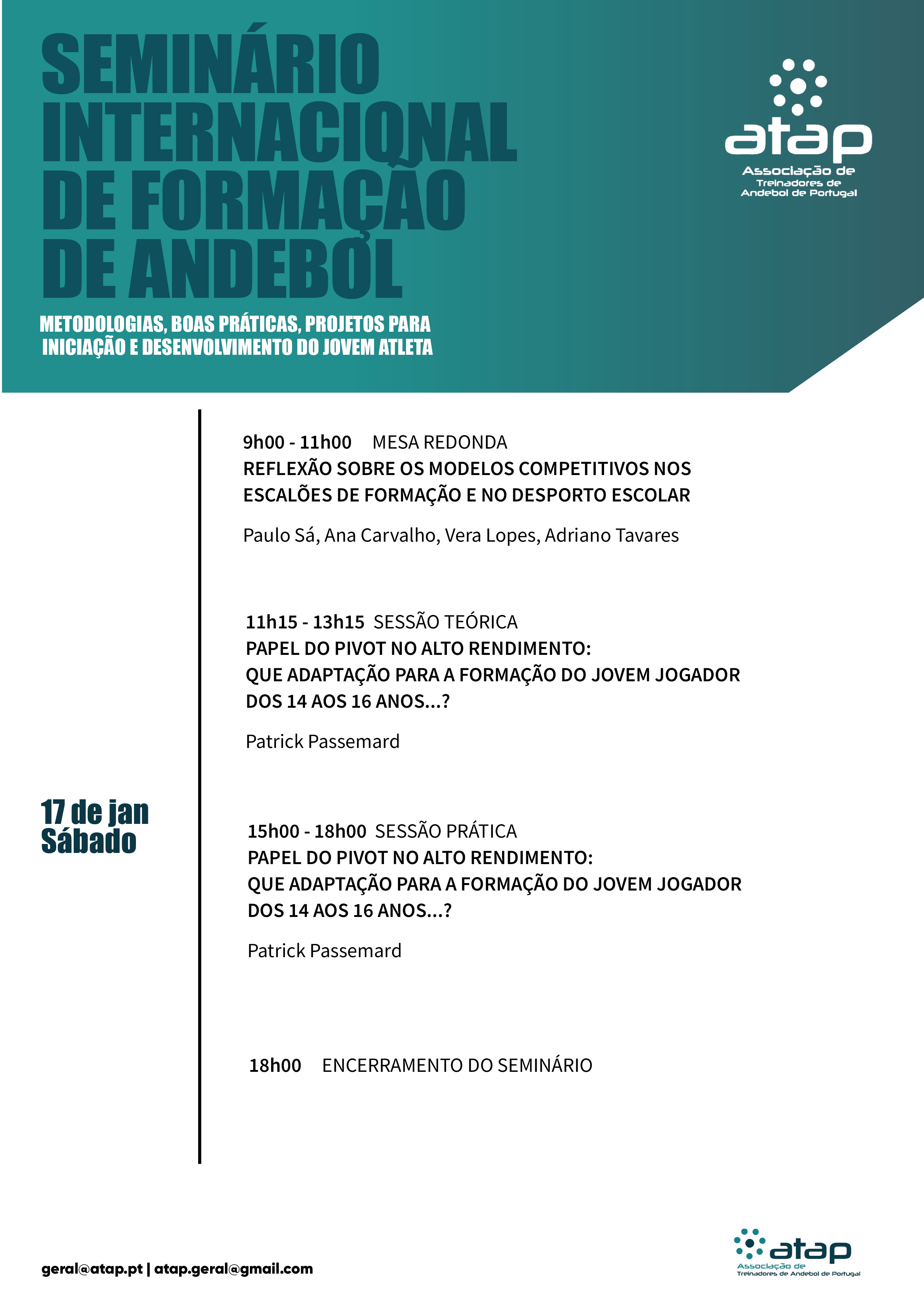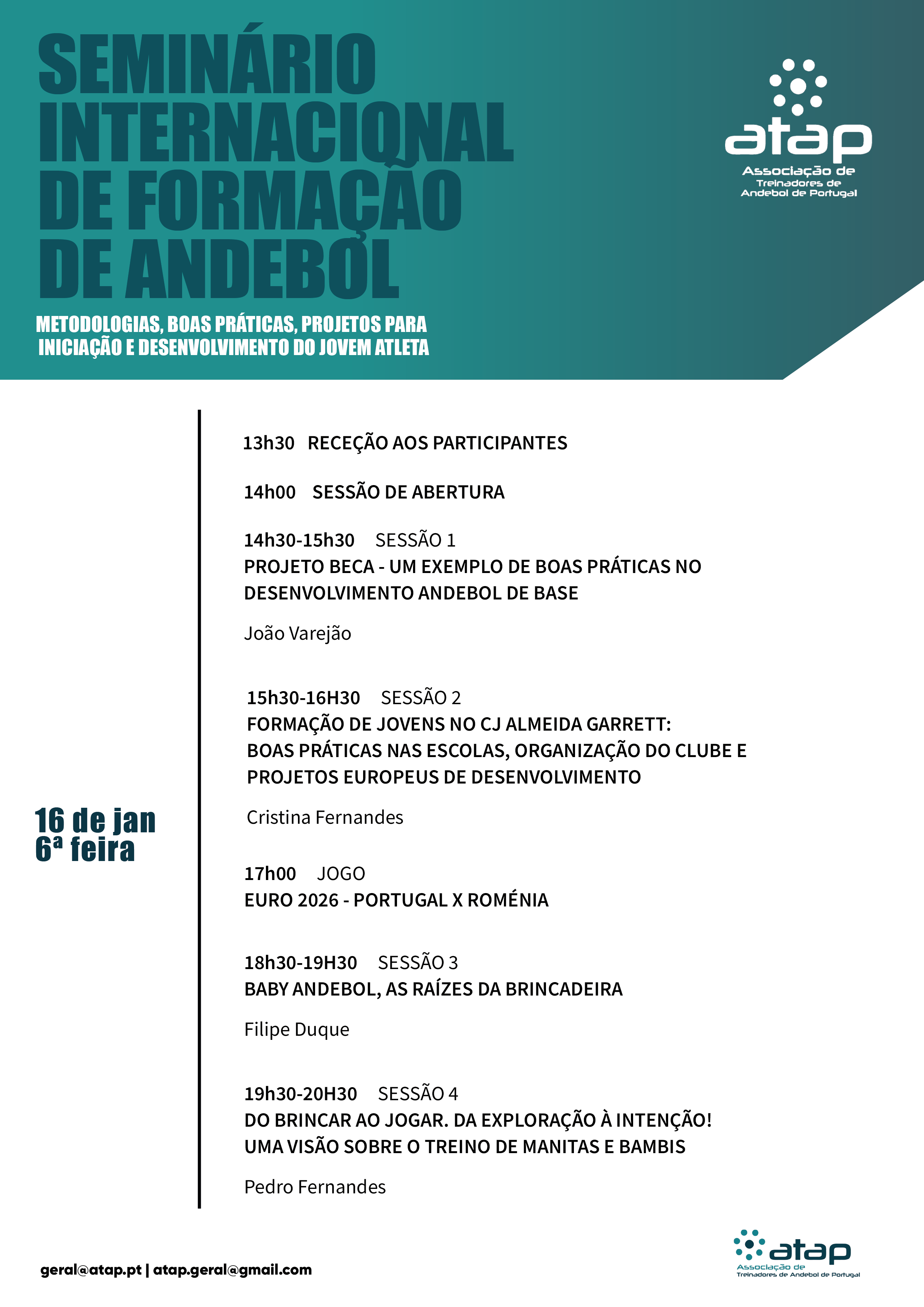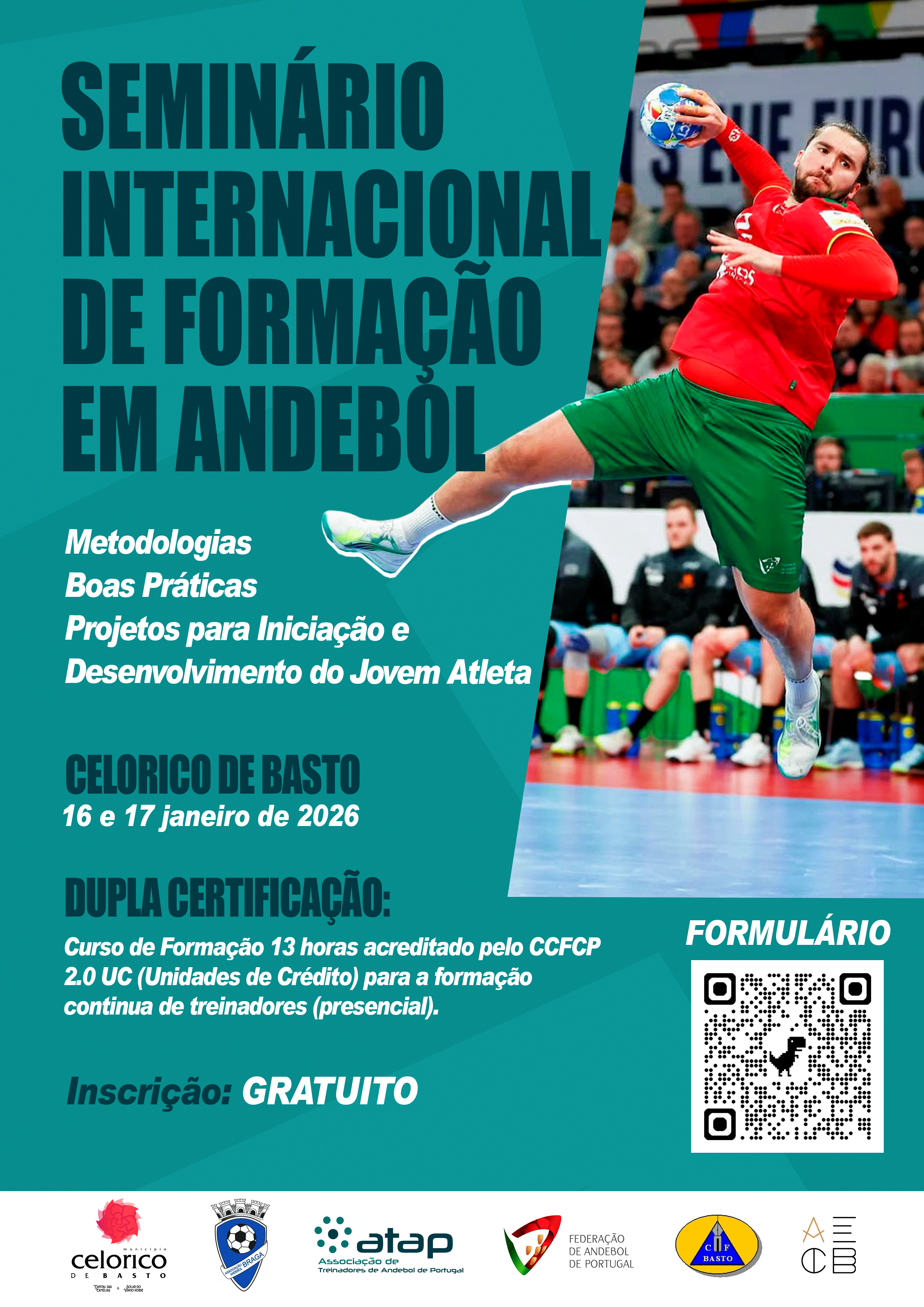 A Associação de Treinadores de Andebol de Portugal (ATAP), com o apoio do Município de Celorico de Basto, BECA – Bastinhos Escola Clube de Andebol, e Agrupamento de Escolas de Celorico de Basto, organiza nos dias 16 e 17 de janeiro de 2026 o V Seminário Internacional de Formação em Andebol, subordinado ao tema “Metodologias, Boas Práticas e Projetos para a Iniciação e Desenvolvimento do Jovem Atleta”.