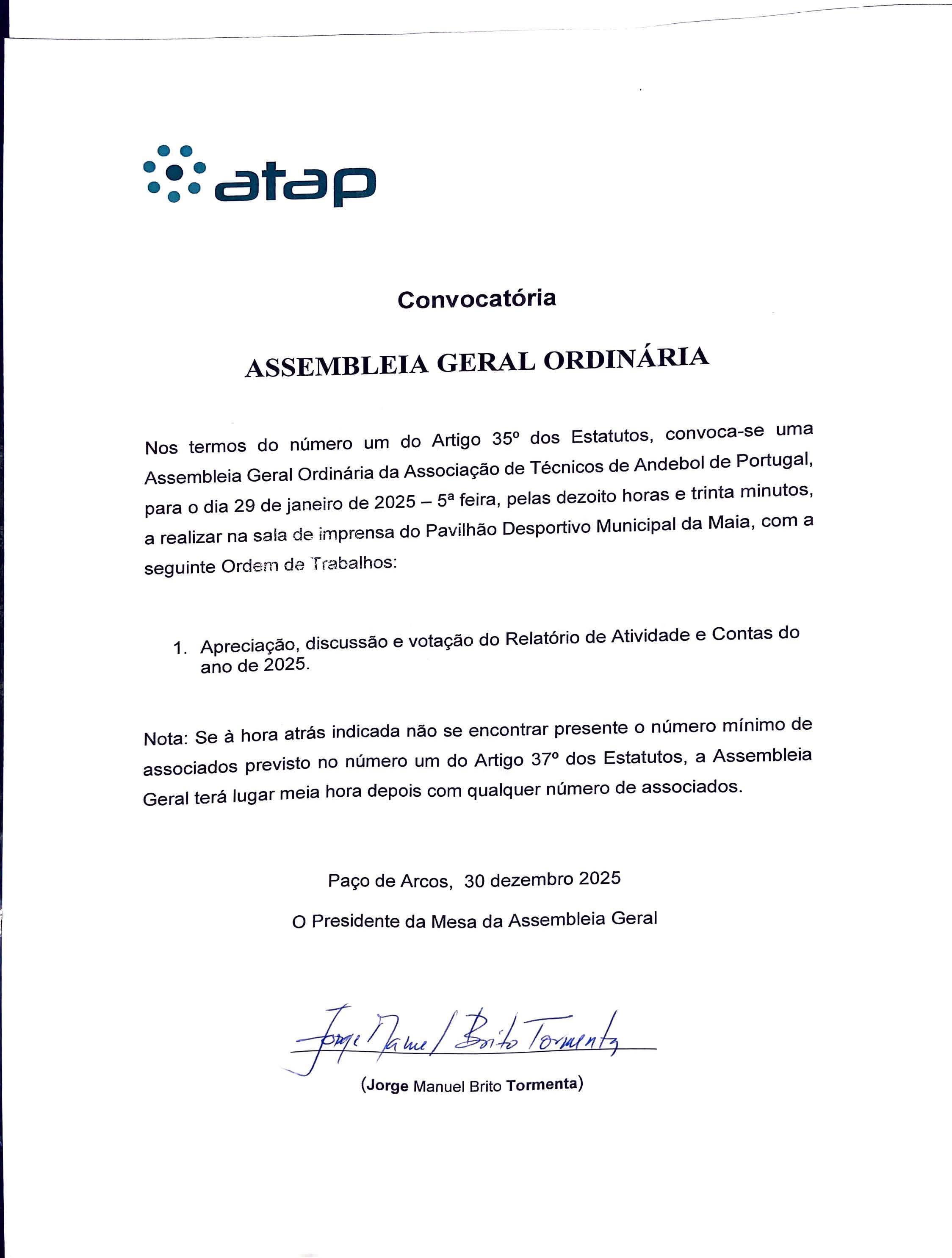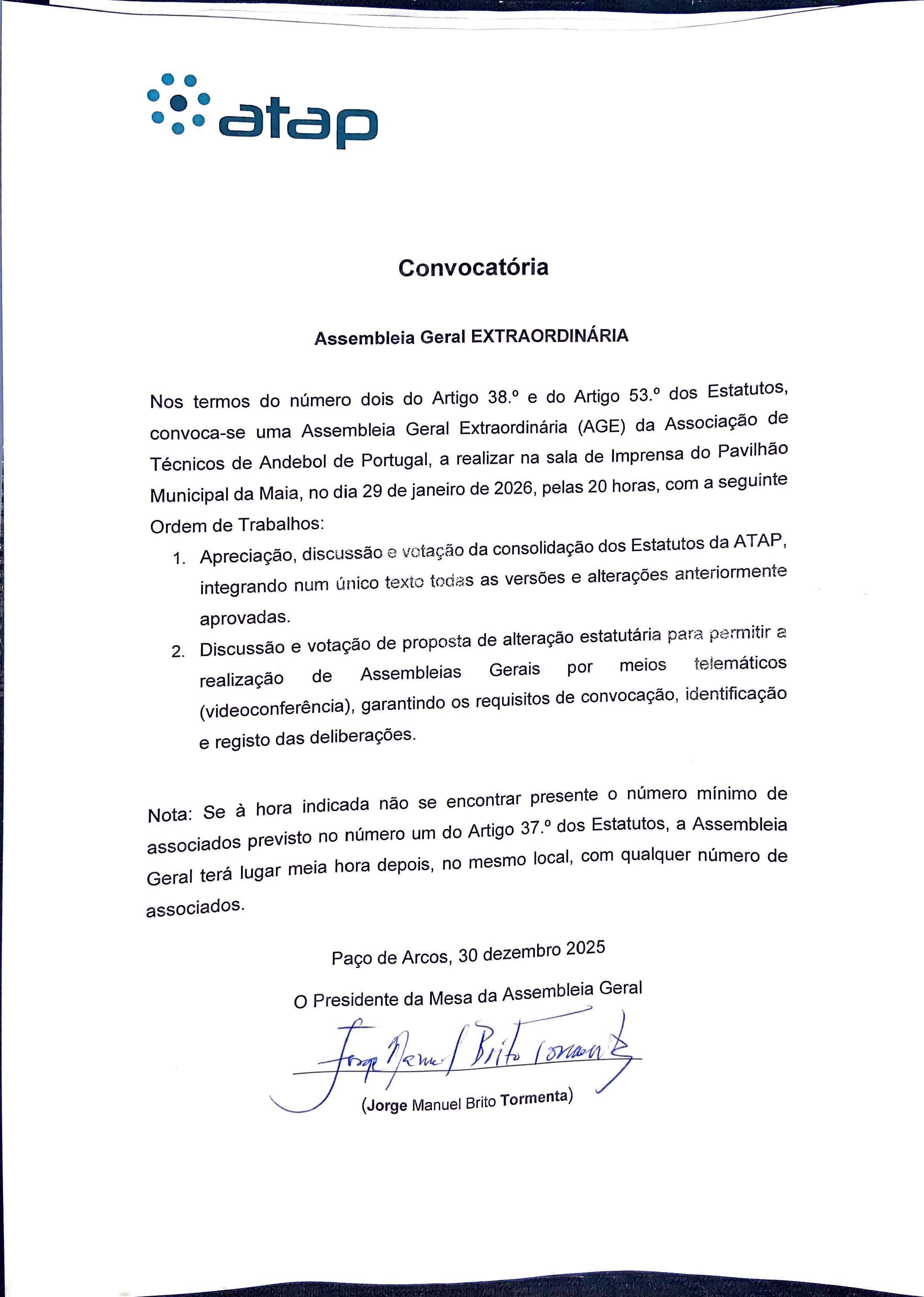 Nos termos estatutários, convocam-se os(as) associados(as) da Associação de Técnicos de Andebol de Portugal (ATAP) para a realização das seguintes Assembleias Gerais, a ter lugar no dia 29 de janeiro de 2026, na Sala de Imprensa do Pavilhão Municipal da Maia: